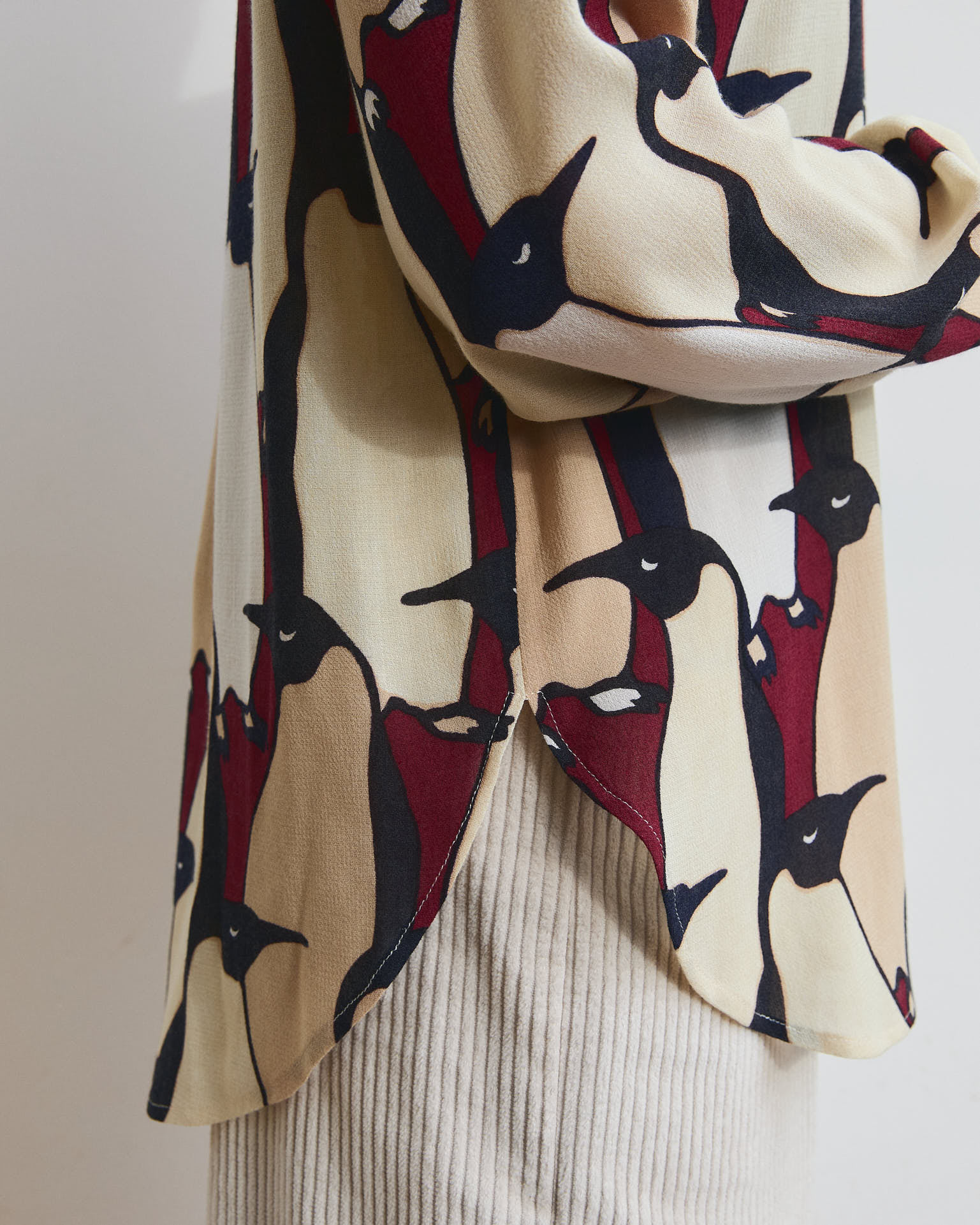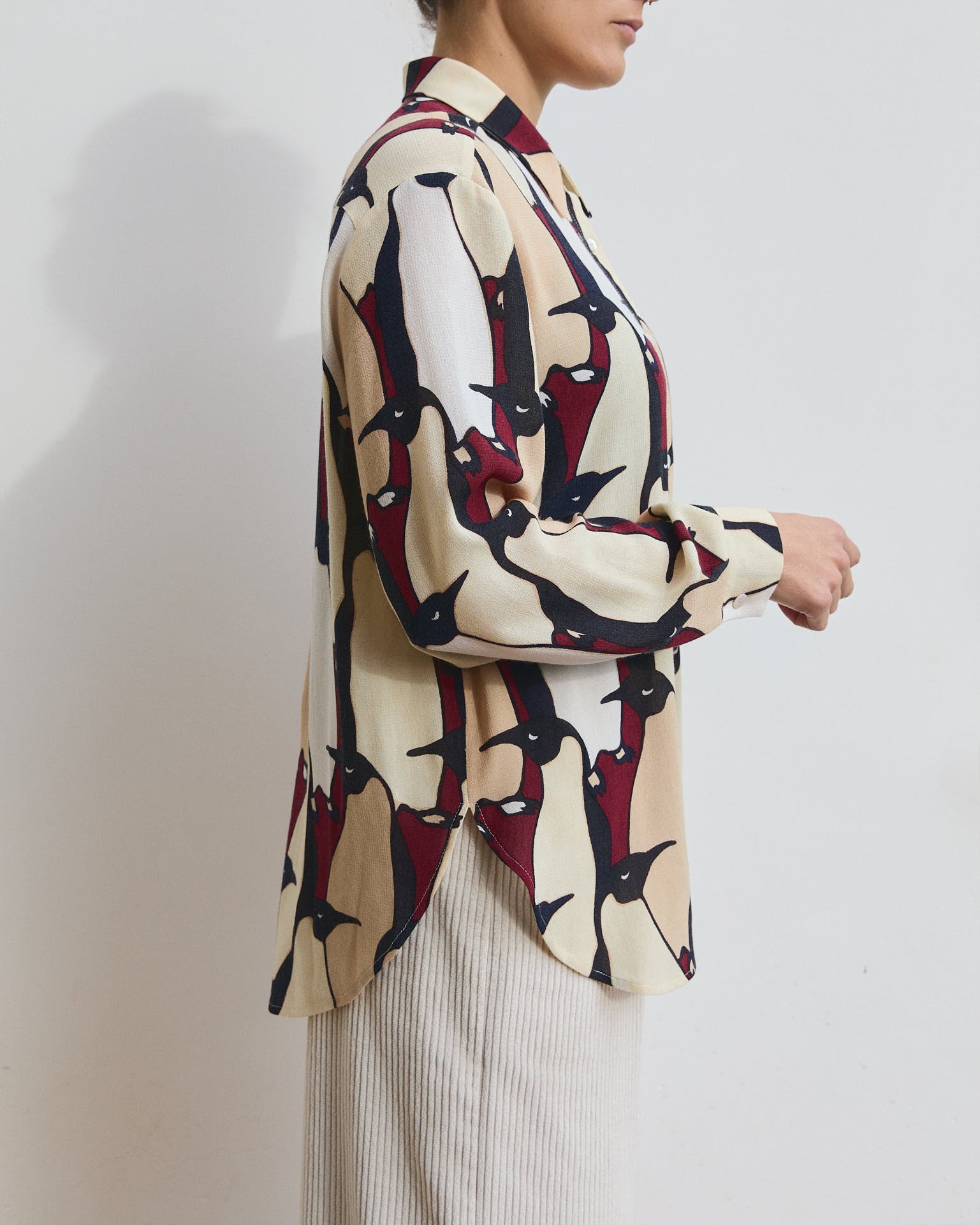 Per questa versione ho utilizzato un tessuto di viscosa vintage che custodivo da tempo, impreziosito da una deliziosa fantasia a pinguini. Un disegno che mi fa sorridere ogni volta e che sono felicissima di aver finalmente trasformato in un capo. La viscosa ha una caduta fluida, un peso perfetto per una camicia invernale ed è piacevolissima sulla pelle.