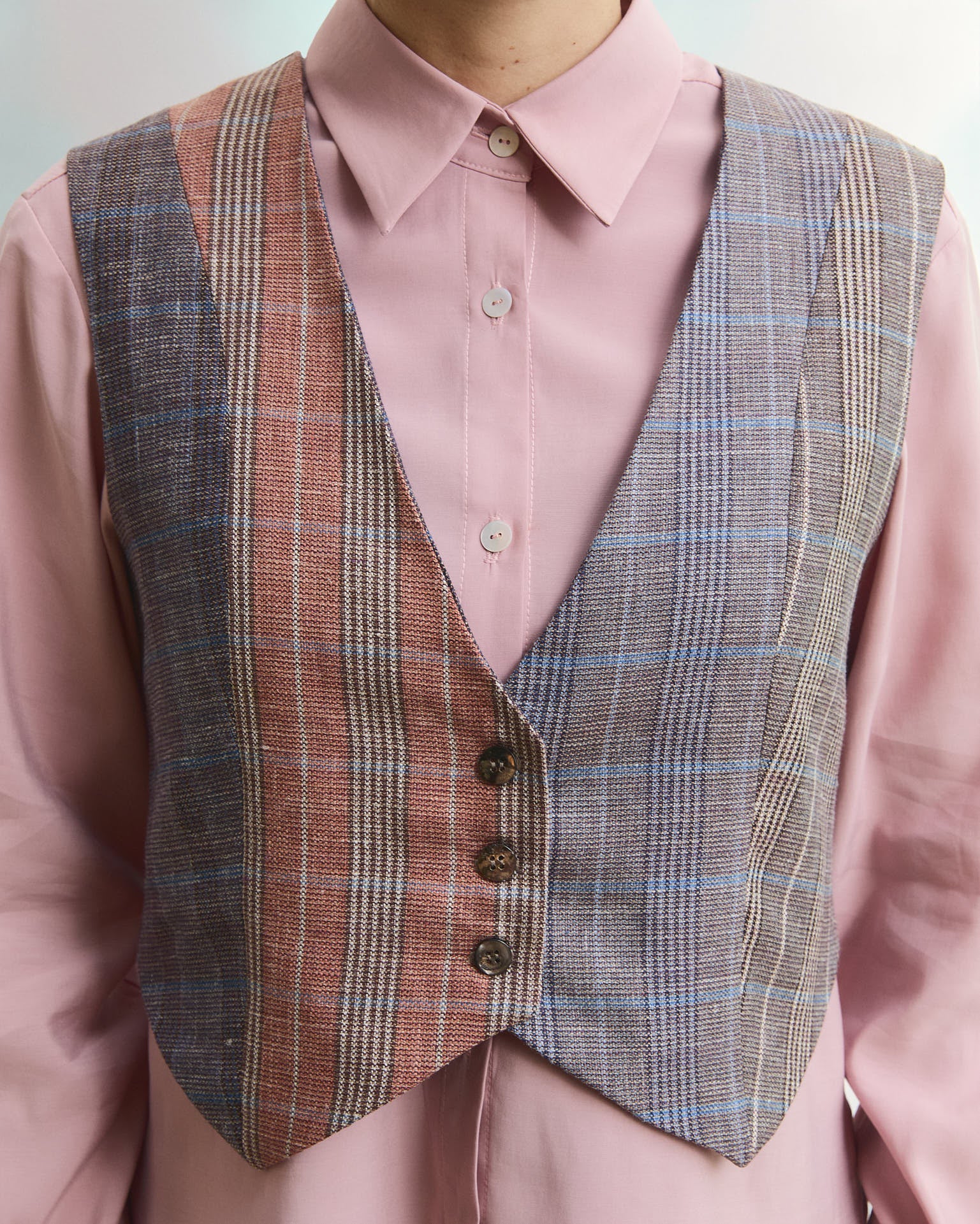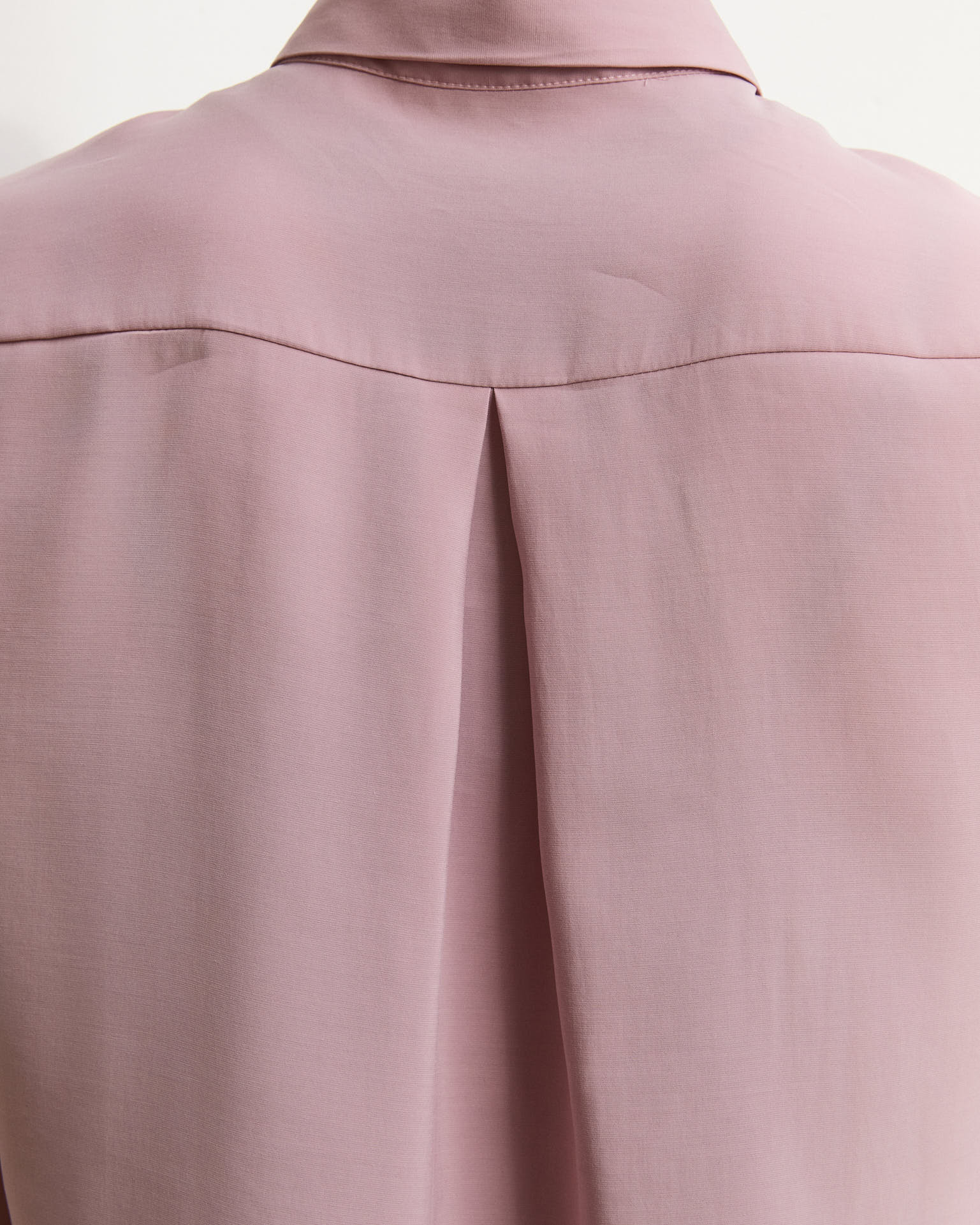 Per questa versione ho scelto un tessuto che amo per la sua mano e la sua caduta: un cupro di viscosa dalla texture “mano pesca”, morbida e vellutata come la buccia di una pesca, in un elegante tono Rosa Conchiglia. Un colore luminoso e raffinato, che dona freschezza al volto e si abbina con sorprendente facilità ai toni neutri come crema, grigio e cioccolato.