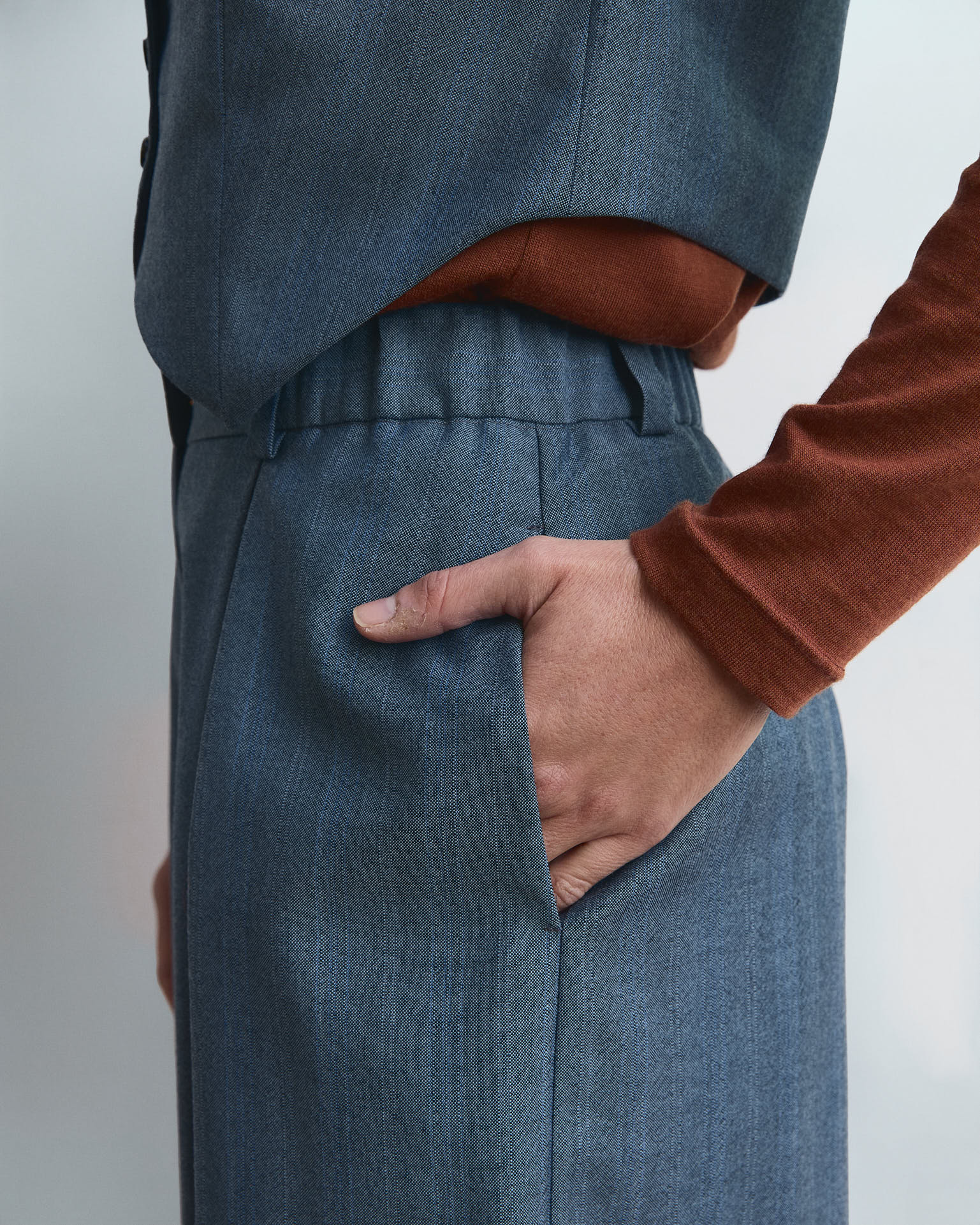 Accanto a lui, il gilet Pecìn completa il look con una struttura essenziale ma dal carattere deciso. Riprende la linea dei gilet classici, rivisitata in chiave contemporanea, con una vestibilità morbida che segue la figura senza stringere. È realizzato nello stesso tessuto in 100% lana del pantalone ed è interamente foderato in viscosa, così da scivolare bene su maglie e camicie.
