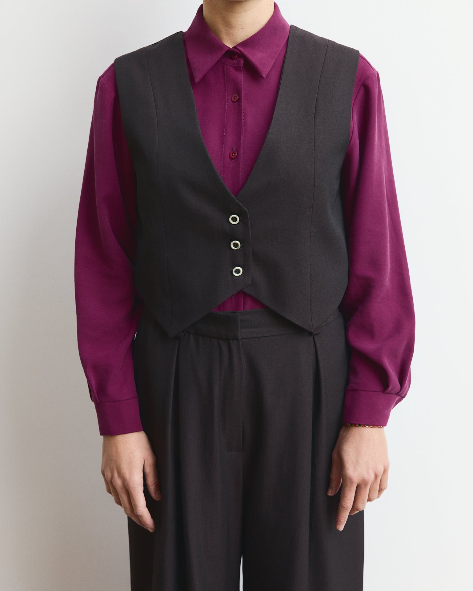 Chiuso da tre bottoni sul davanti, ha una lunghezza pensata proprio per dialogare con la vita alta del pantalone, creando un insieme armonioso e ben proporzionato. È un capo versatile, che veste bene fisicità diverse, con più o meno seno.