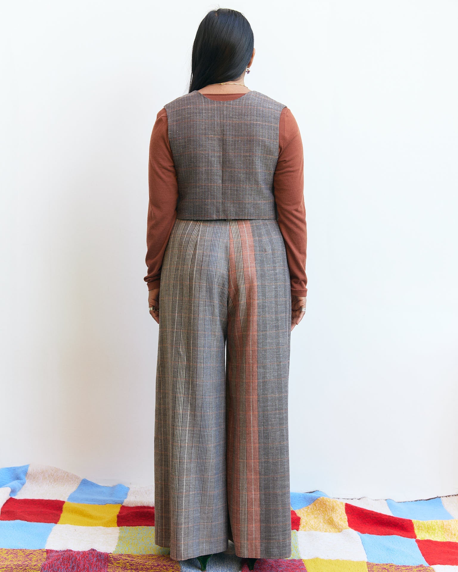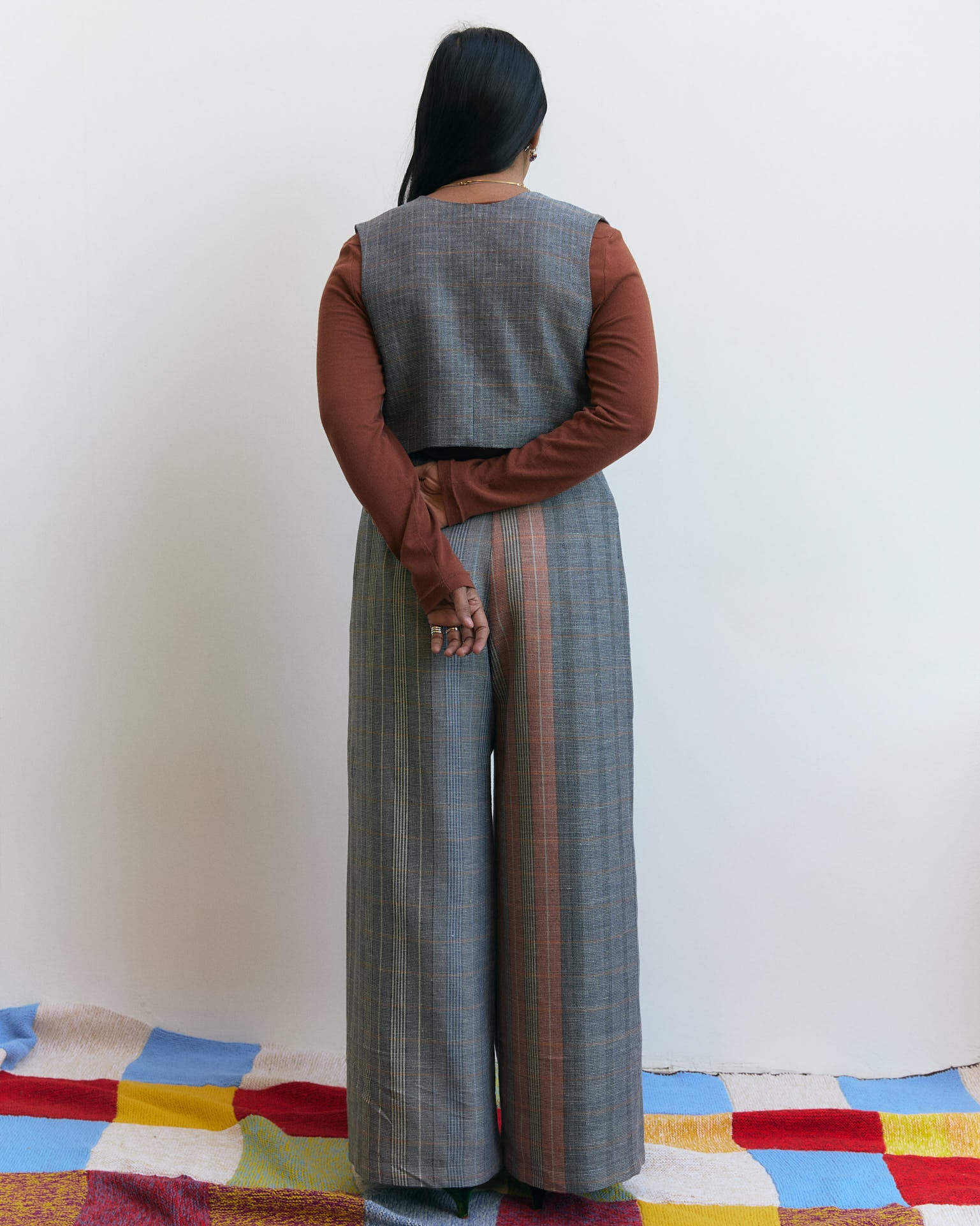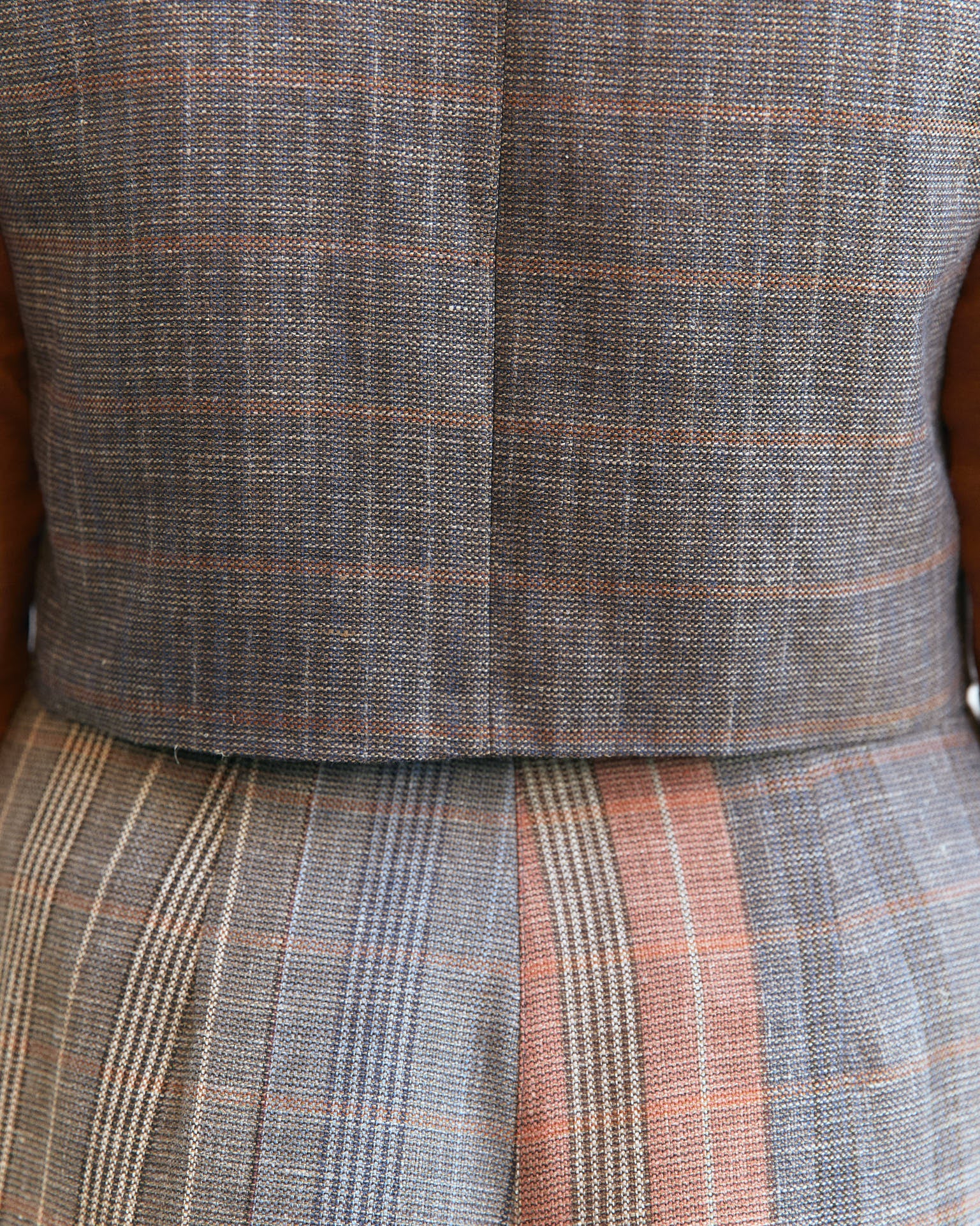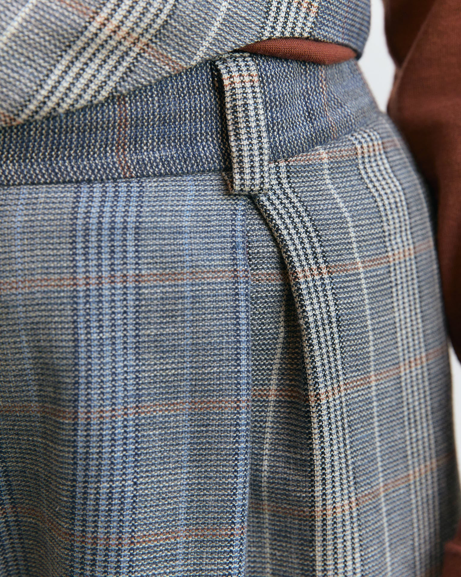 Questo modello è un pezzo unico, davvero. È realizzato in pura lana di recupero proveniente da prove di tessitura, un tessuto destinato a non essere mai utilizzato, che ho trasformato in un completo speciale. Una stoffa che avvolge. Non punge, non pesa: scalda con eleganza. Lana e seta intrecciate con cura, in quattro varianti simili ma mai identiche. Sullo stesso rotolo convivono quattro strisce con lievi differenze di colore e trama: una fantasia scozzese dai toni morbidi, fili rossi, gialli, blu, grigi e crema che cambiano intensità, rendendo ogni parte irripetibile.