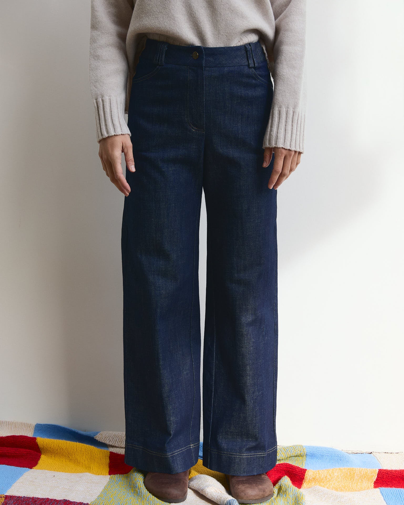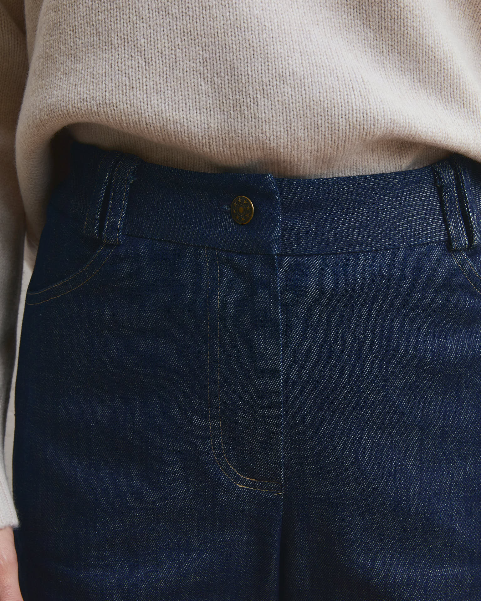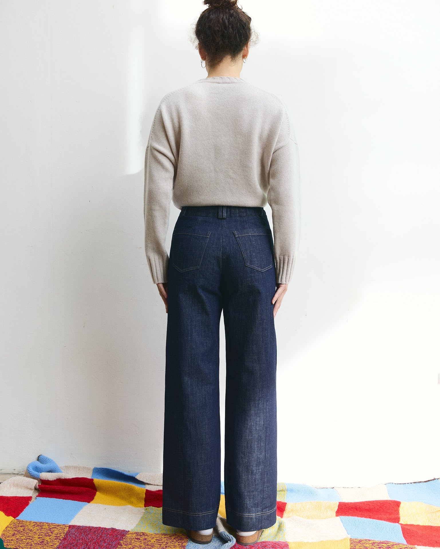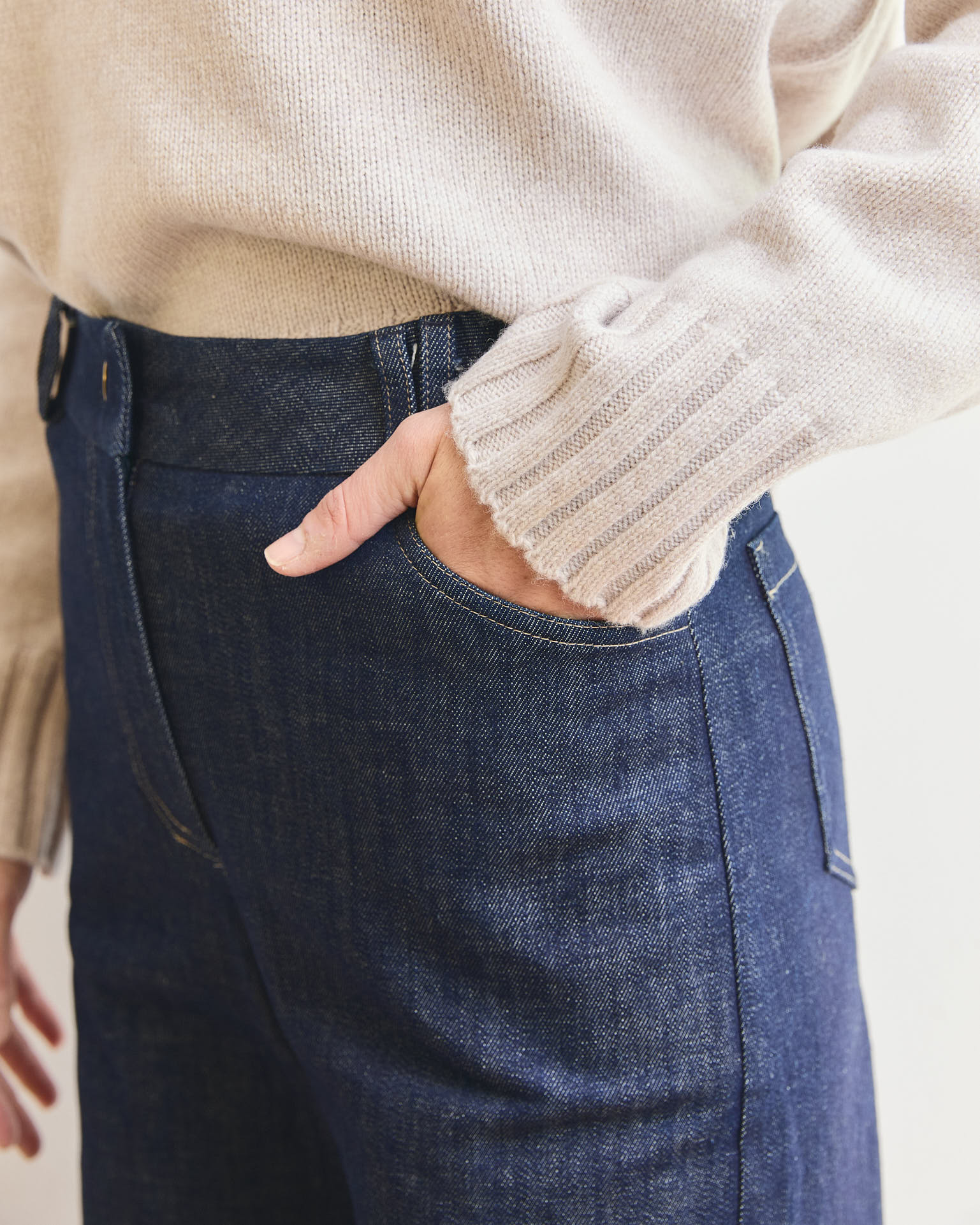 Il pantalone Mainà è un jeans in stile worker ispirato ai classici modelli sailor: gamba ampia e leggermente svasata, tasche sia davanti che dietro e cuciture completamente ribattute per una maggiore resistenza.