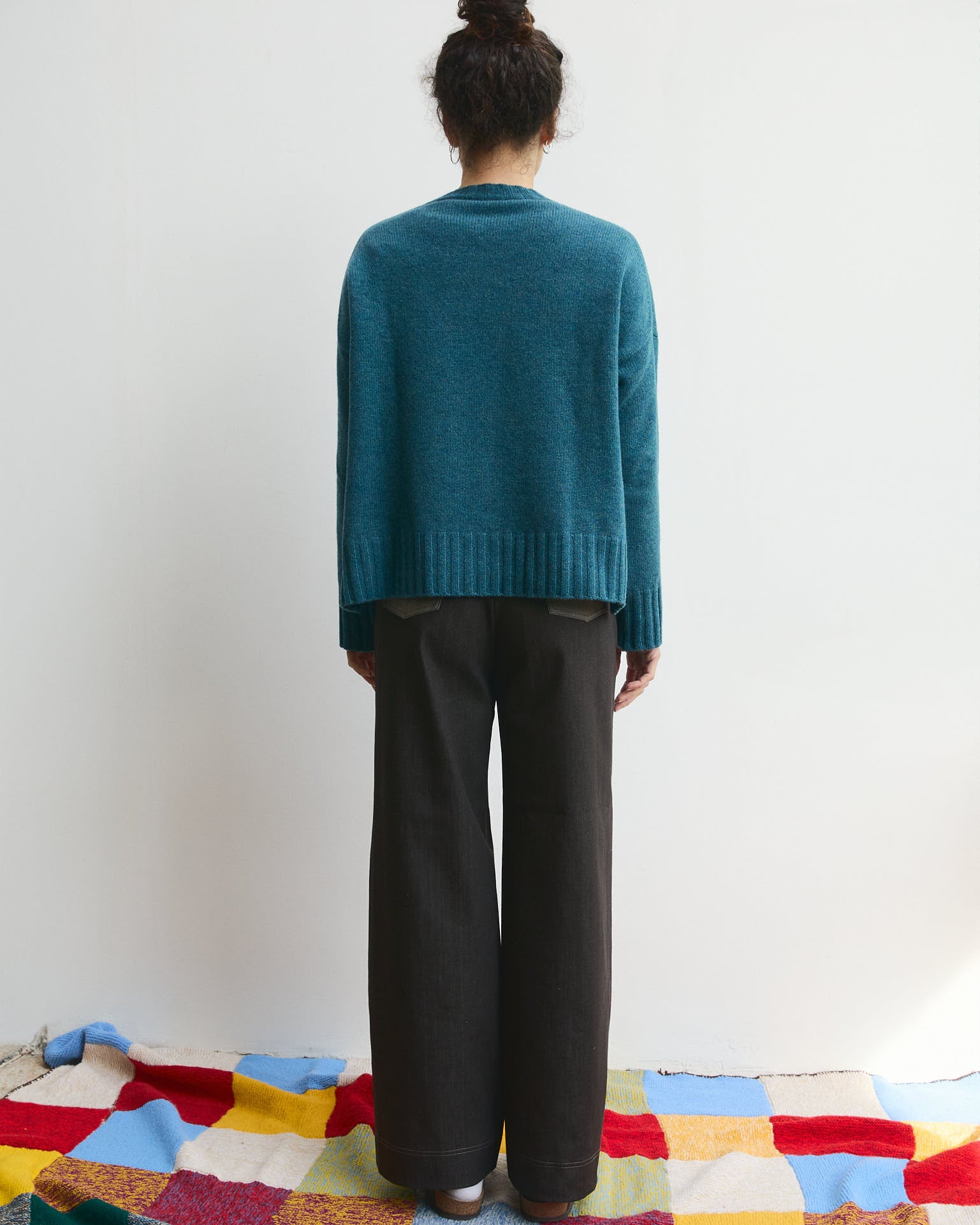 La modella con il maglione Verde oceano è alta 175 cm e indossa la taglia XS/S.