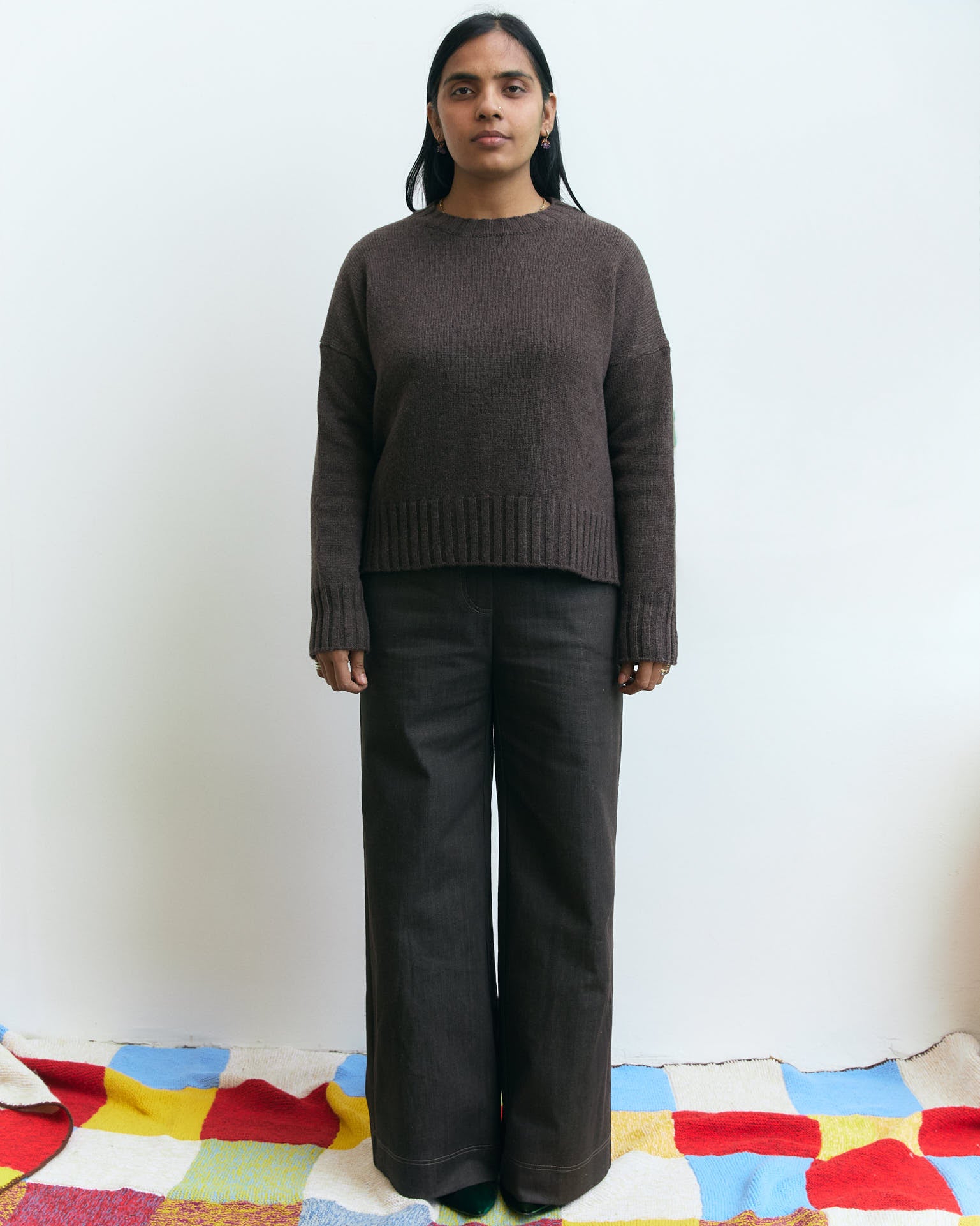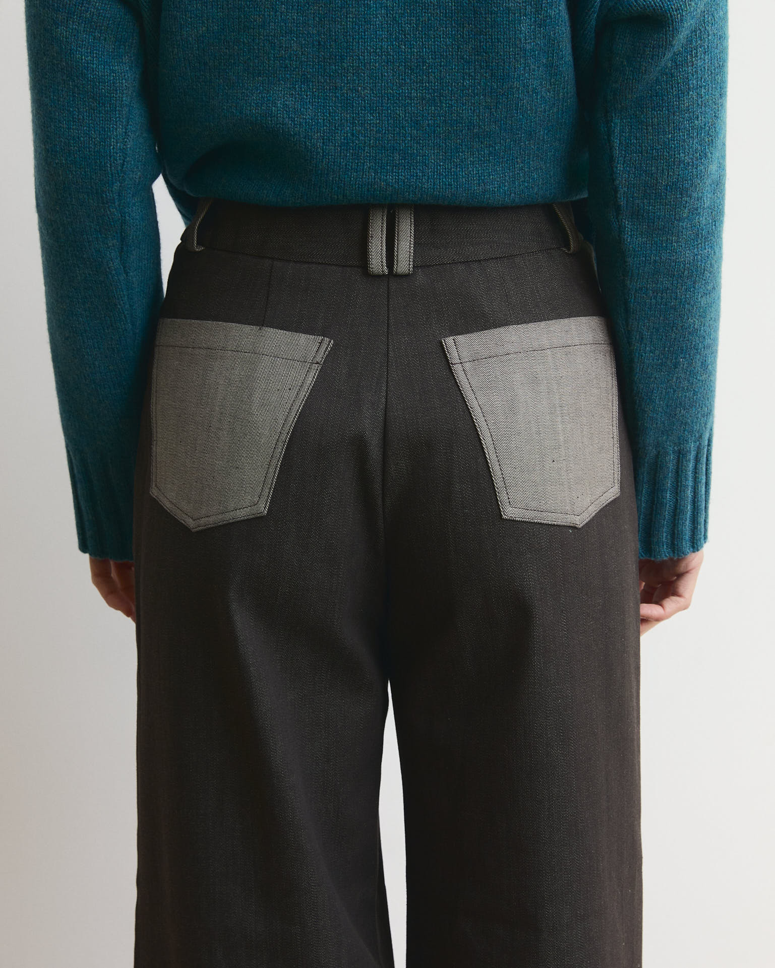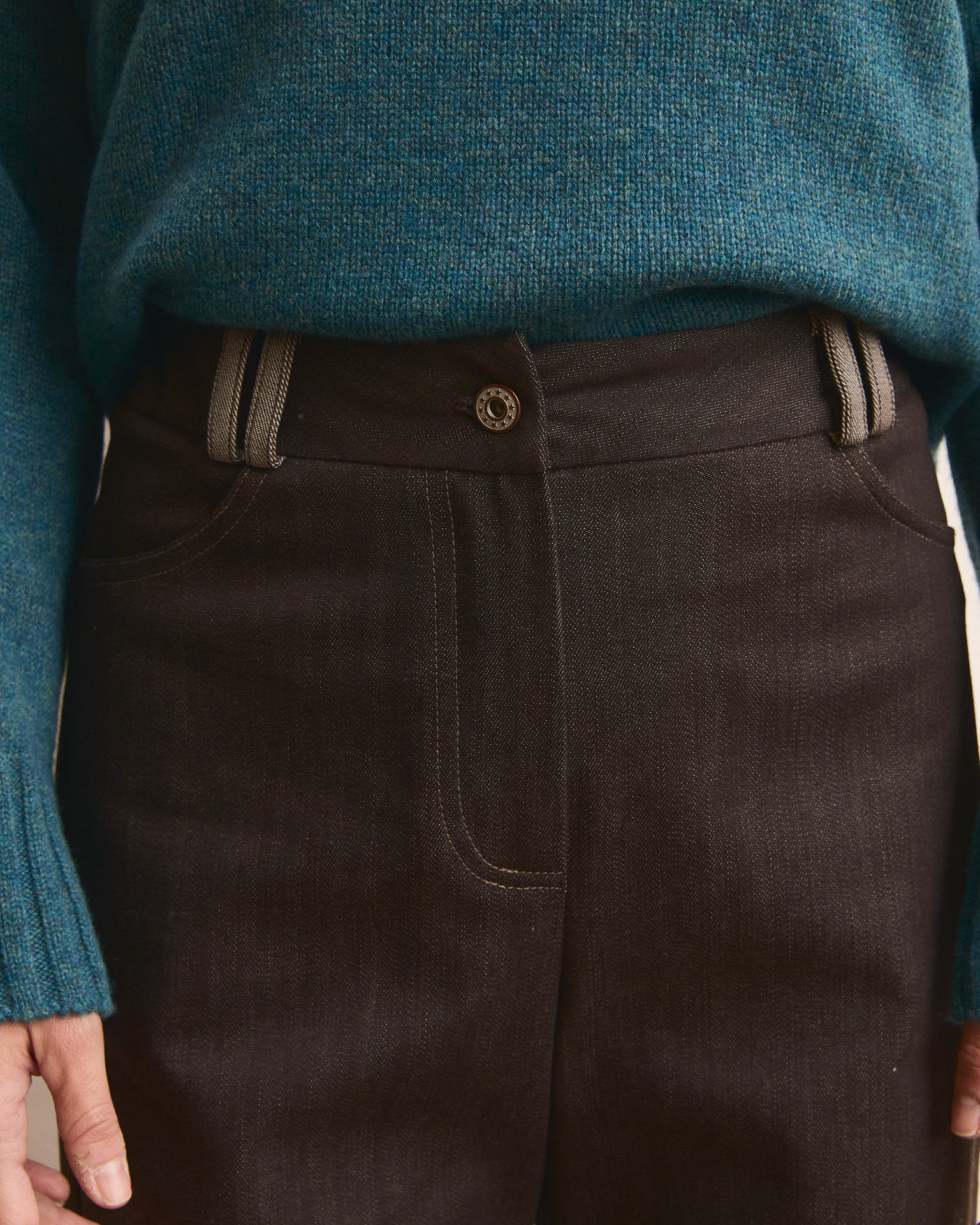 È realizzato in un denim color Moka ( marrone scuro) pesante e strutturato, perfetto per l’inverno e pensato per dare volume mantenendo una linea slanciata. La vita segue il corpo senza stringere: sul retro ho inserito una parte elastica per migliorare la vestibilità, mentre davanti trovi la chiusura con zip e bottone tipico dei jeans.
