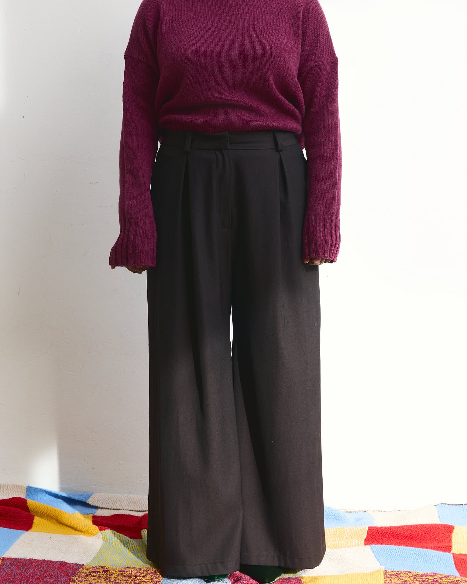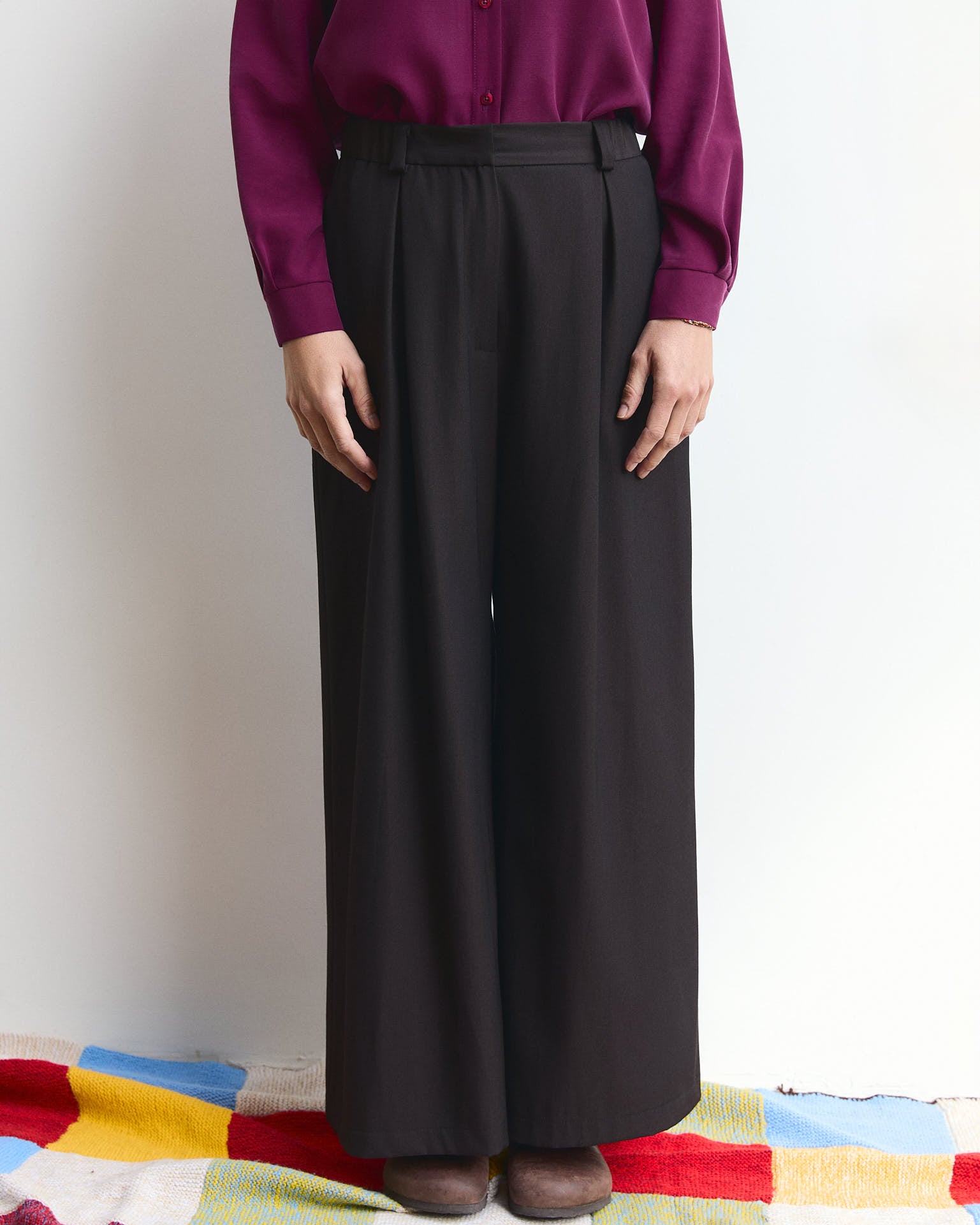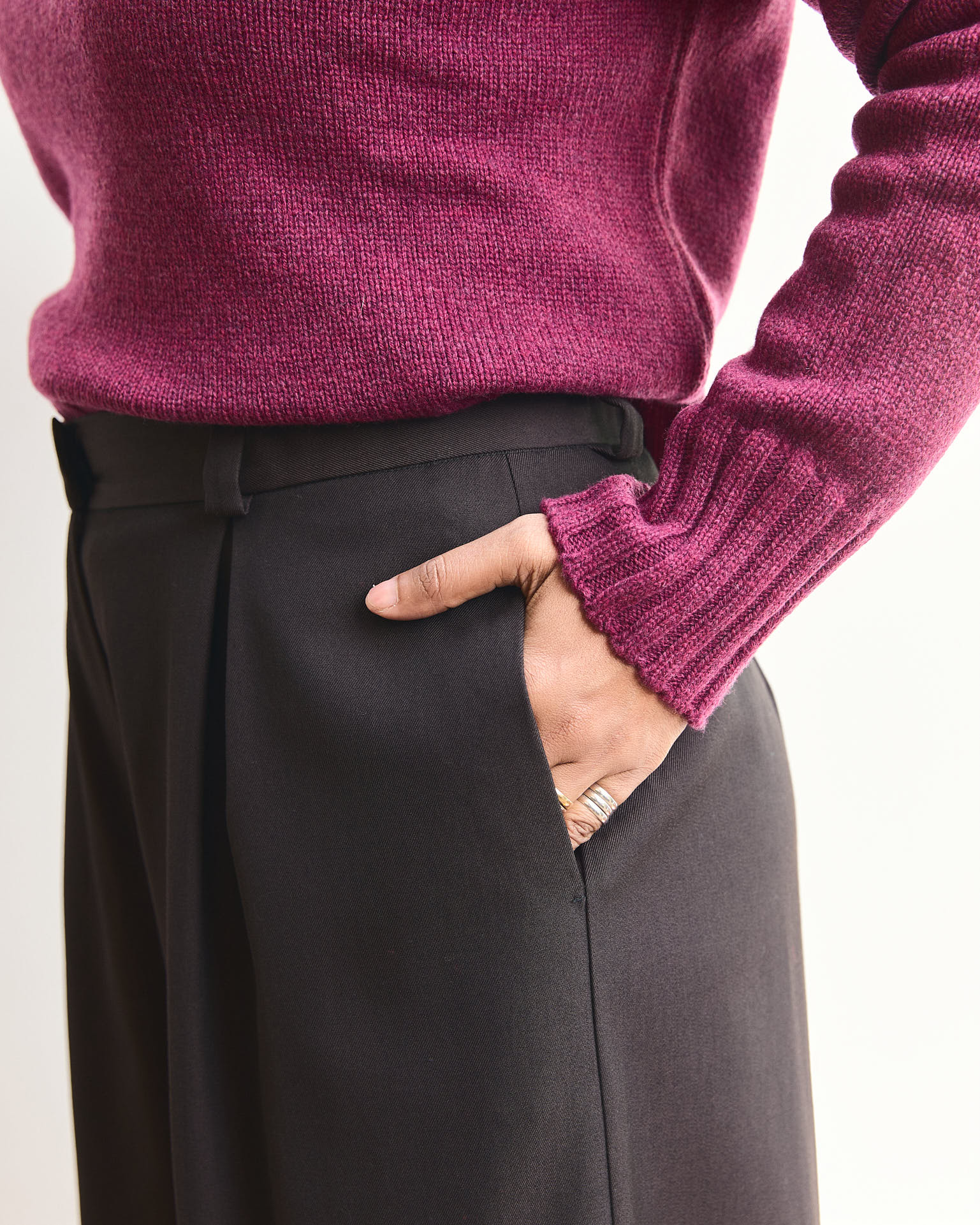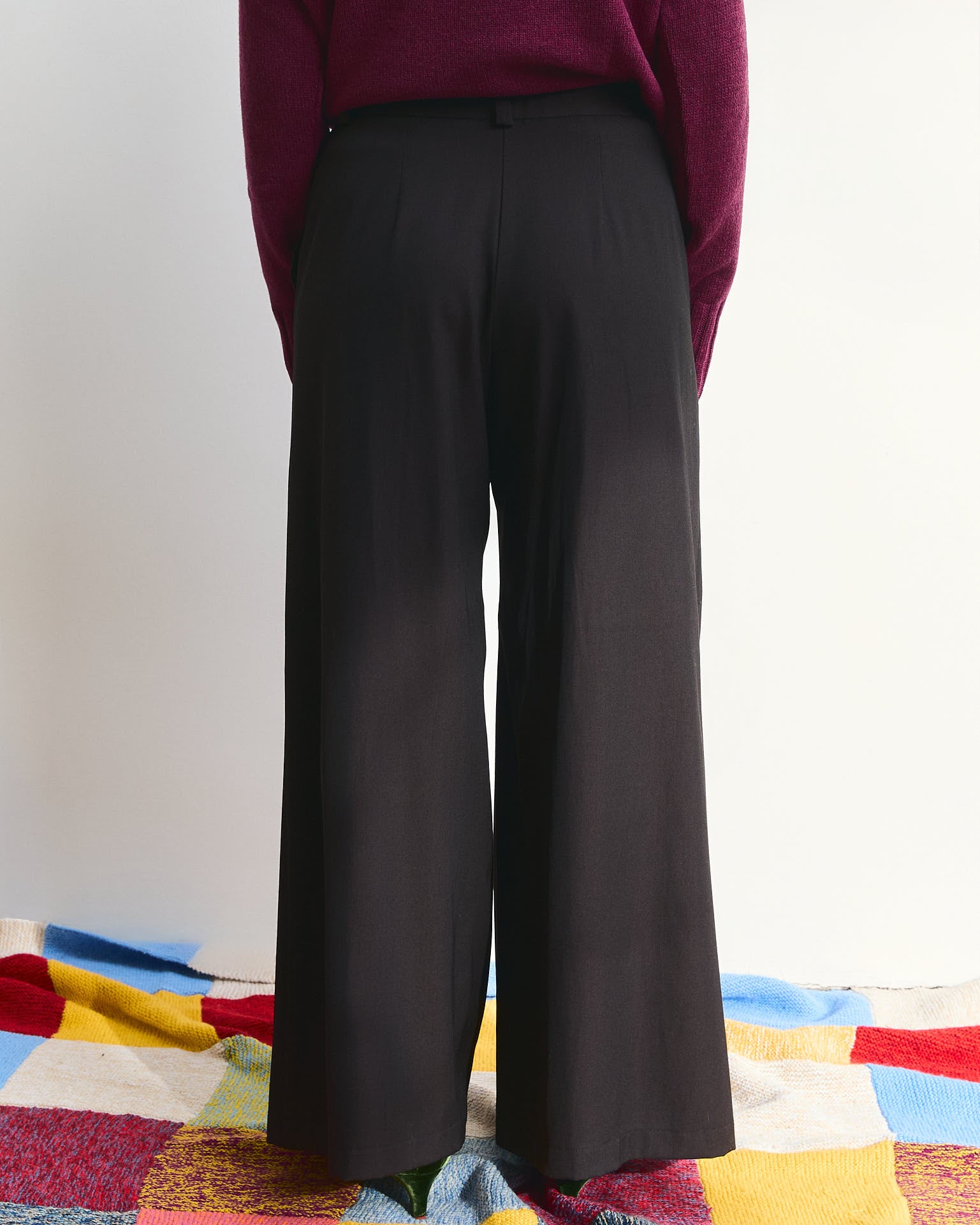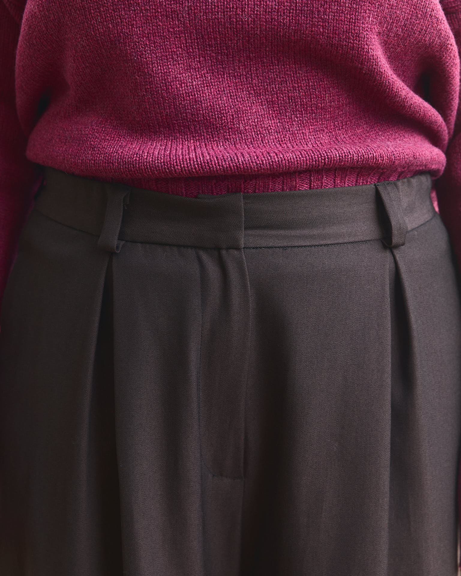 La gamba ampia e leggermente svasata si apre con delicatezza, segue i passi senza mai stringere, e le pinces sul davanti disegnano una linea pulita, ispirata ai dettagli dei pantaloni sartoriali maschili.