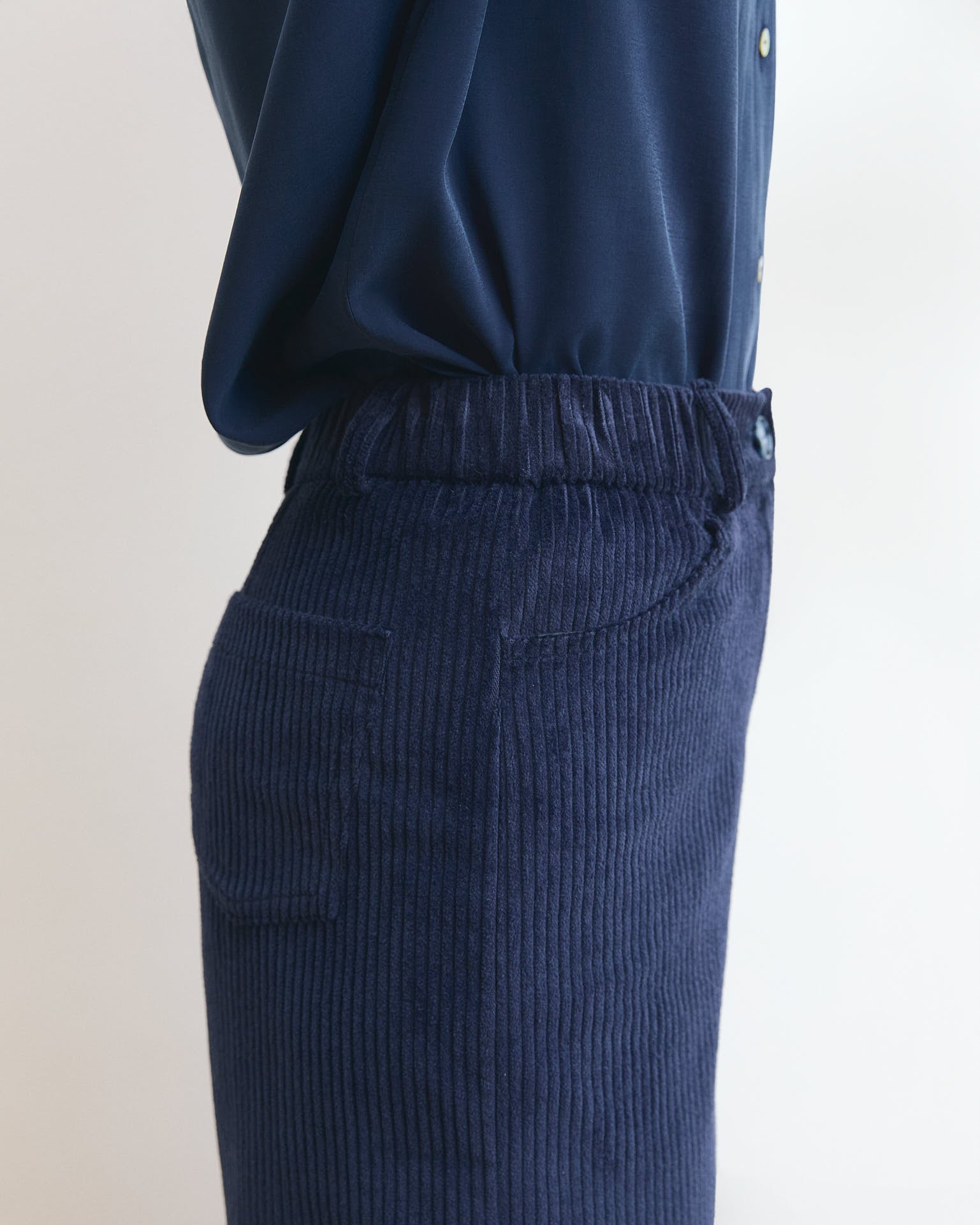 Questa versione è realizzata in velluto blu notte, morbido e accogliente, ideale per l’inverno. La vita segue il corpo senza stringere: sul retro ho inserito una parte elastica per una vestibilità più confortevole, mentre davanti trovi la chiusura con zip, bottone e passanti per la cintura.