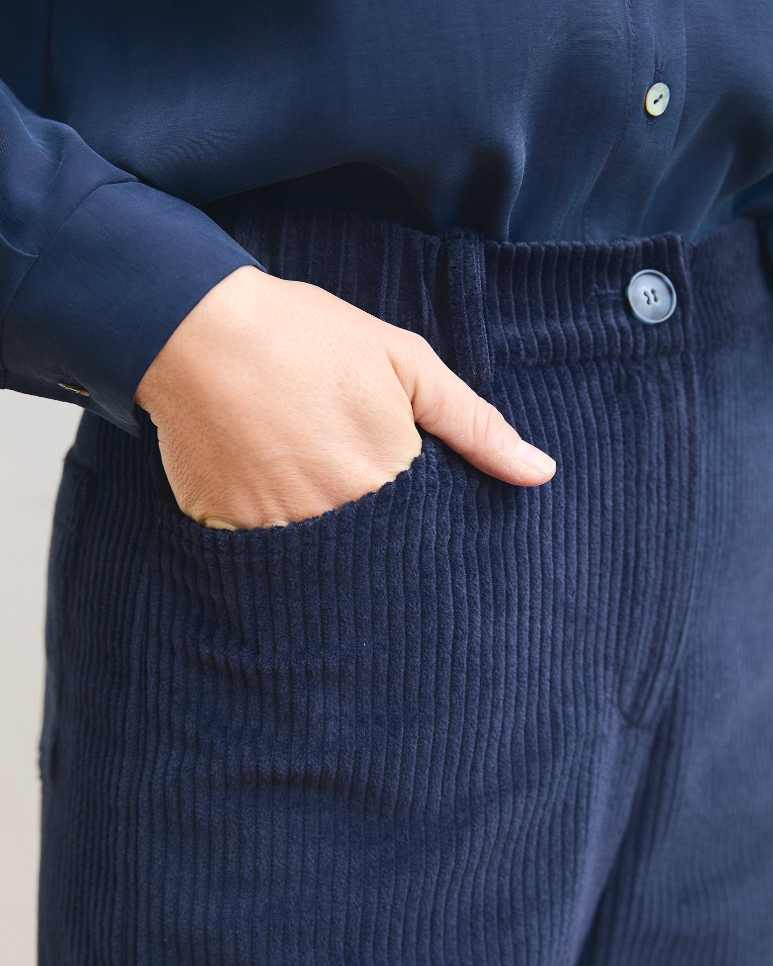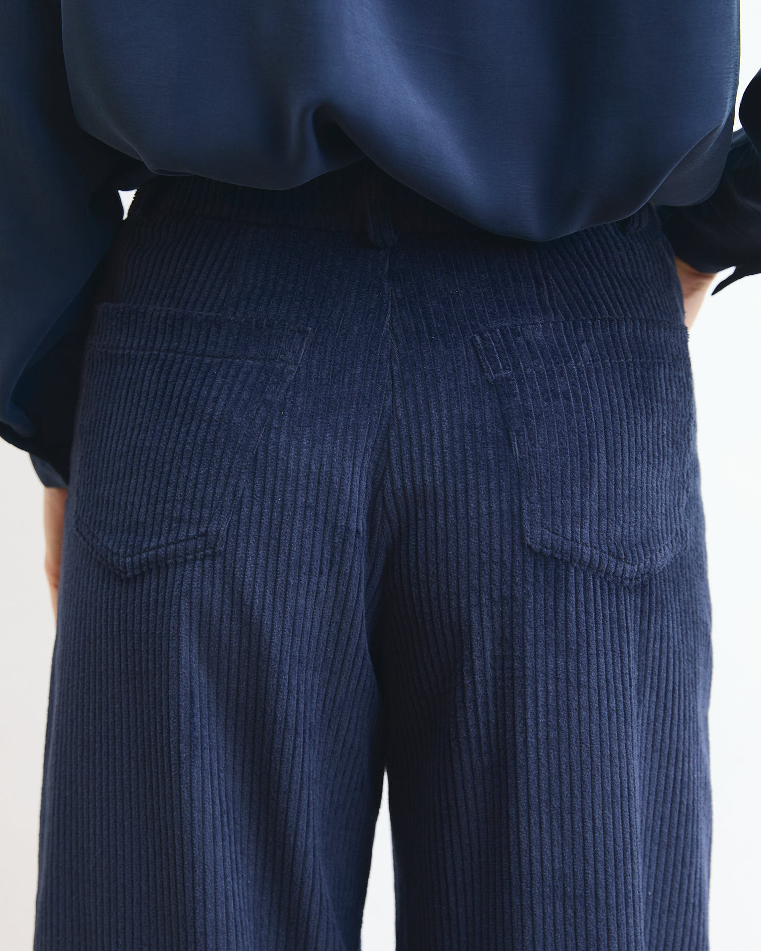 Il pantalone Mainà prende ispirazione dai classici modelli sailor: gamba ampia e leggermente svasata, tasche davanti e dietro e cuciture ribattute per una maggiore resistenza.