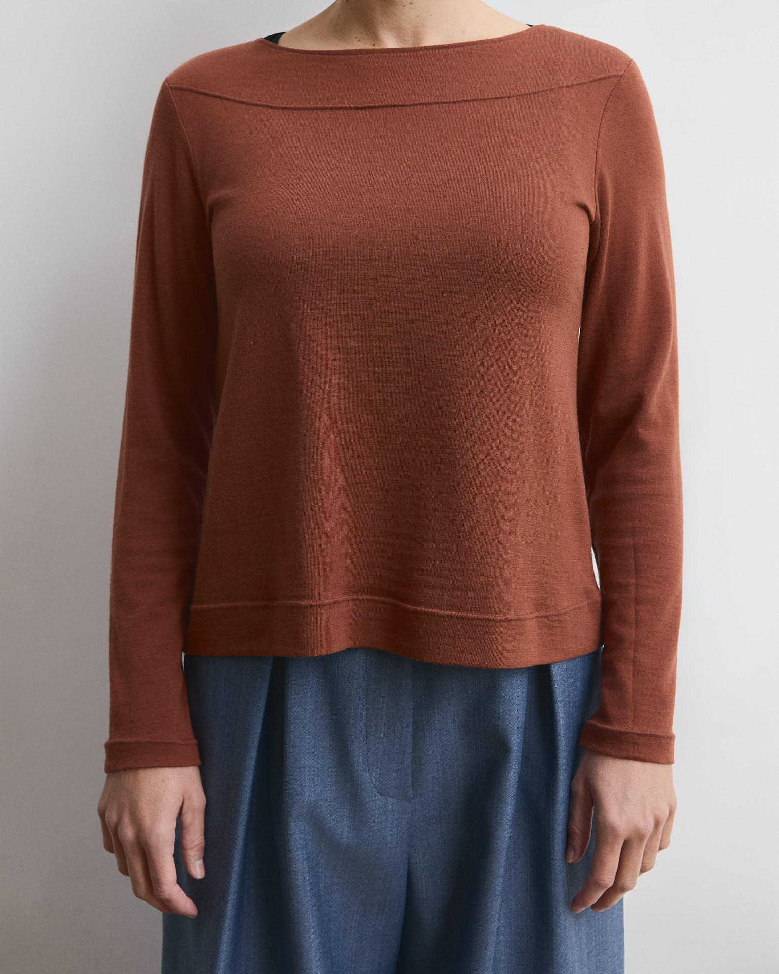 Il modello ha manica lunga, uno collo a barchetta non troppo ampio e una delicata ribattitura a mezzaluna sullo scollo, un piccolo dettaglio che le dà carattere pur mantenendo la sua natura essenziale. Tutte le cuciture sono rifinite con doppia ribattitura.
