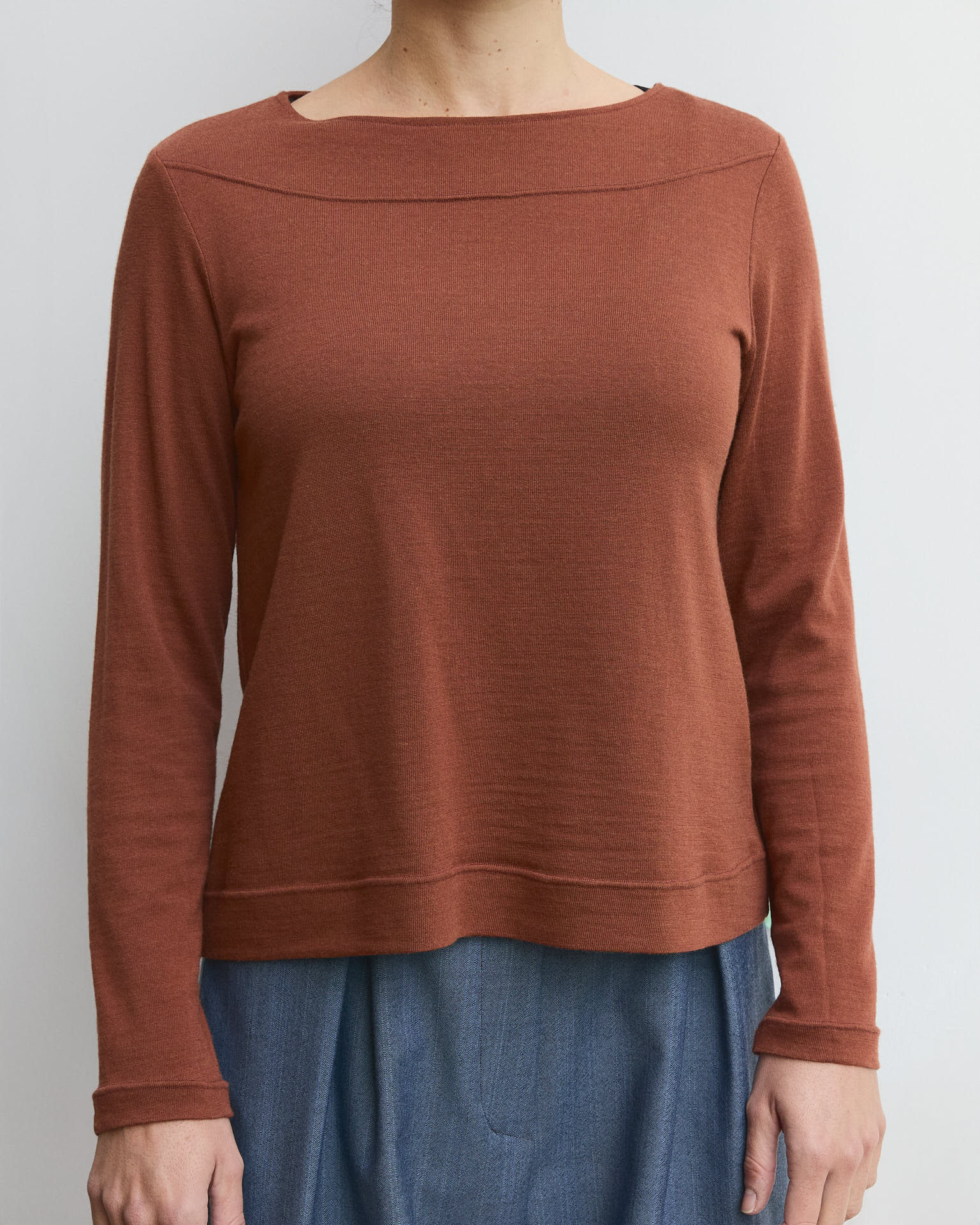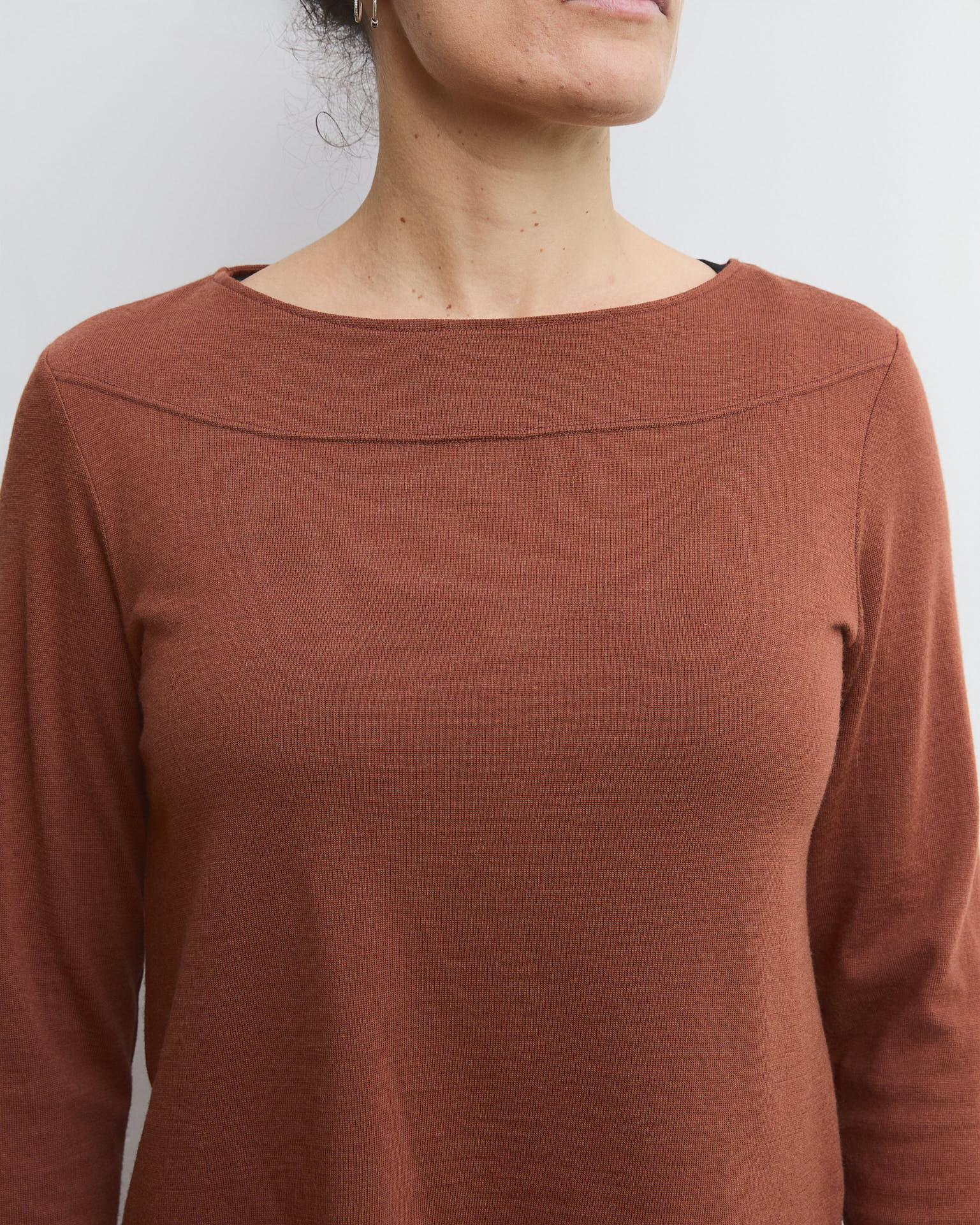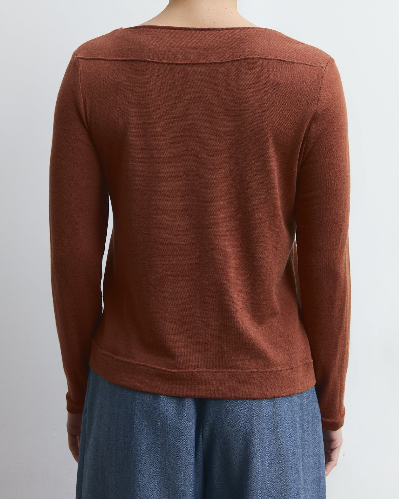 La T-shirt Lüna è il capo essenziale pensato per accompagnarti durante la stagione fredda, da sola o stratificata sotto i tuoi maglioni o ai gilet Pecìn. È realizzata in un morbido jersey di lana e viscosa color Ruggine, un materiale caldo, leggero sulla pelle e che non punge: una coccola quotidiana.